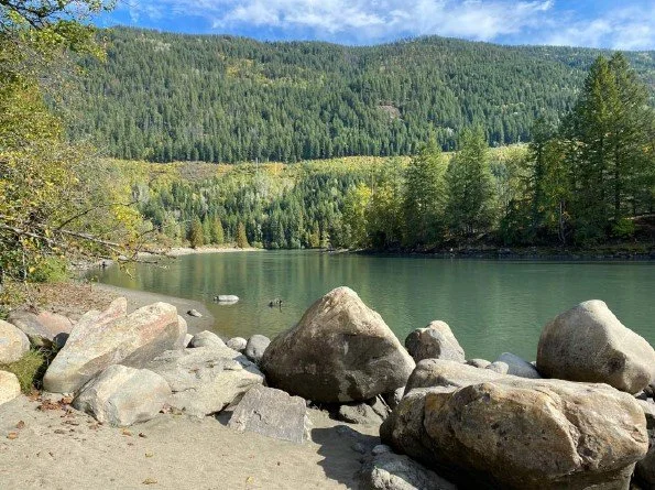 Northwestern end of Trout Lake, near where the Lardeau River enters the lake. The upper (northwesterly ) end of Trout Lake, which Bouchard and Kennedy (1985) described as a Sinixt “encampment at the site of the settlement of ‘Trout Lake City,’” which is also the location from whence a portage could be made to Upper Arrow Lake. Mattina provided a spelling of sənp̓?̓míp derived from an original orthography provided by Ray.